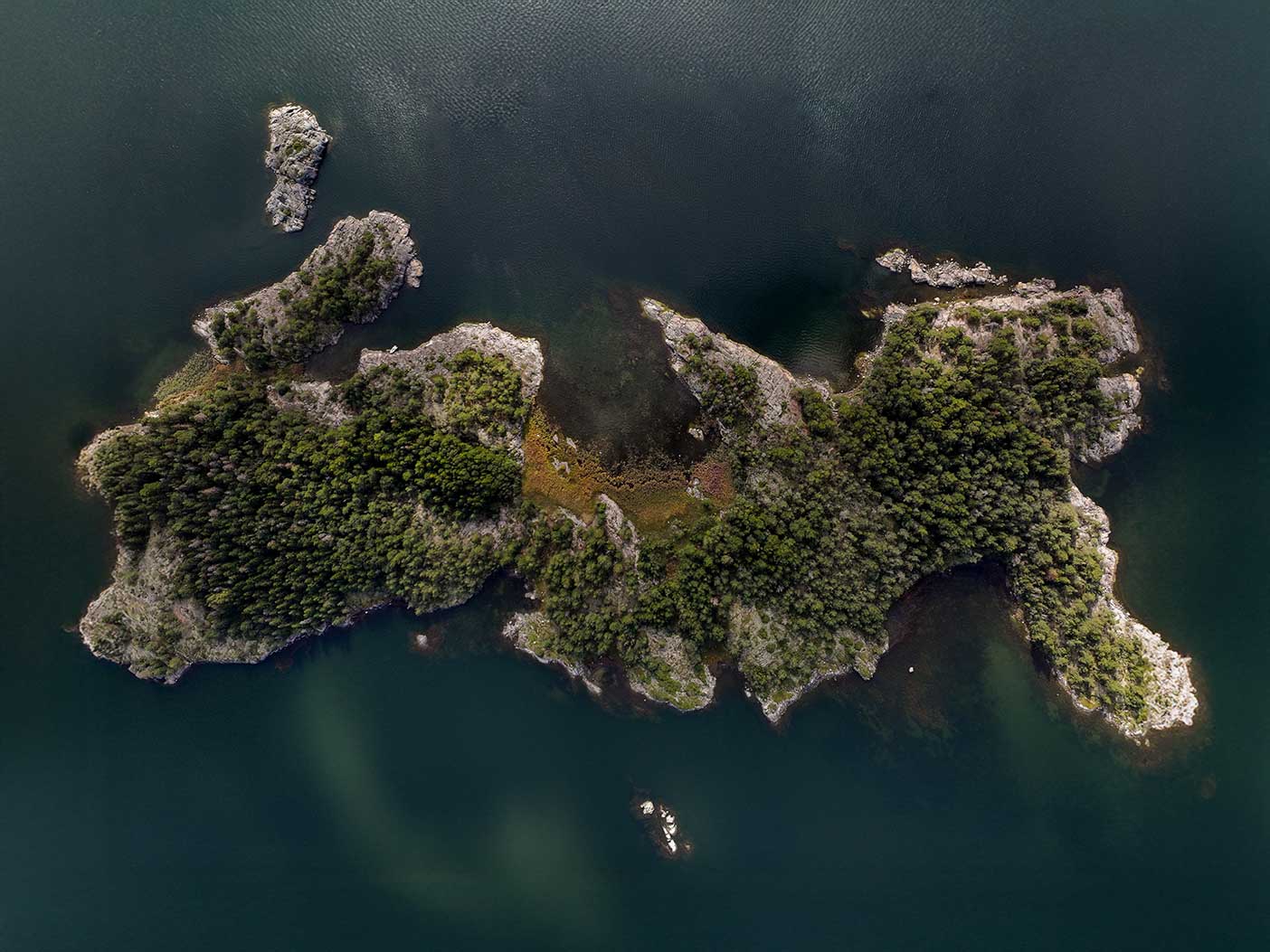 The immediate surroundings feature a dense forest, home to a colony of herons that nest annually in the high canopy. The island’s topography is distinct and varied: the eastern end is defined by rugged rock formations and a peninsula extending into the open sea, while the west consists of a series of capes and sheltered inlets, offering shifting views of both the coastline and the island’s interior.
