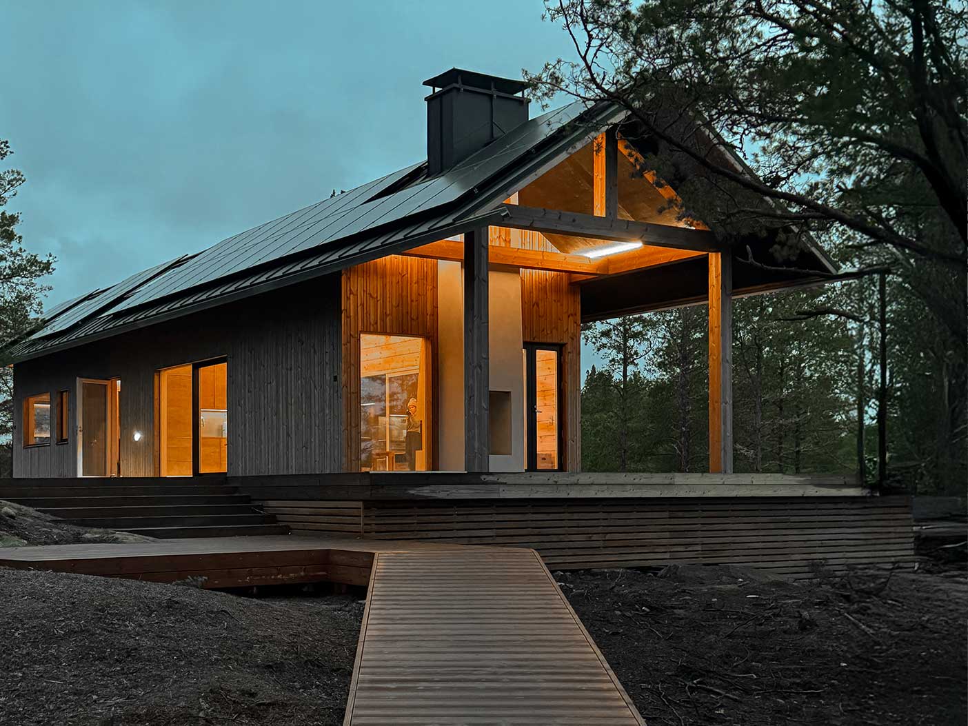 The residence is a contemporary addition to this untouched landscape. While the setting is secluded, the interior offers the functionality of a modern home. Underfloor heating, climate control, and modern bathrooms allow for a convenient stay, while the wood-fired fireplaces and sauna ground the experience in archipelago tradition. Floor-to-ceiling glazing connects the living spaces directly to the wilderness outside.